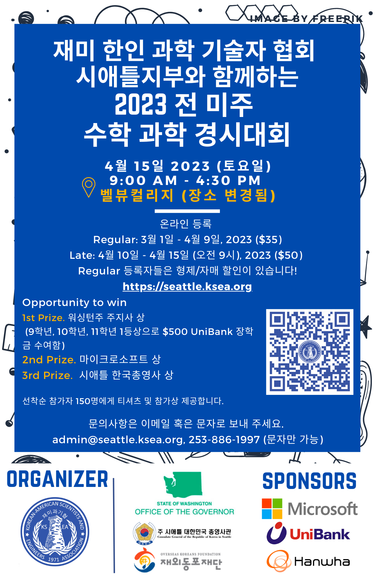 재미한인과학기술자협회(KSEA) 시애틀지부(회장 브라이언 맹)가 당초 4월 15일(토) 레드몬드 마이크로소프트(MS)에서 개최하기로 했던 올해 수학ㆍ과학경시대회 개최 장소가 막판에 벨뷰 칼리지 빌딩 C동 (Bellevue College Building C)으로 바뀌었다.