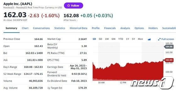10일(현지시간) 뉴욕증시에서 애플은 전거래일보다 1.60% 하락한 162.03 달러를 기록했다.