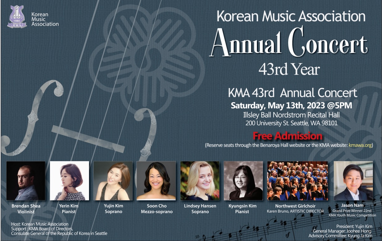 워싱턴주 음악협회(KMAㆍ회장 김유진ㆍ이사장 이제선)가 오는 5월13일 오후 5시 시애틀 베나로야홀 노스트롬 연주홀에서 ‘제43회 정기 연주회’를 개최한다. 예년보다 한 달 앞서 열리는 데다 지난해에도 조기에 매진된 점으로 미뤄 무료지만 관람을 원하는 분은 서둘러 좌석을 예약해야 한다.