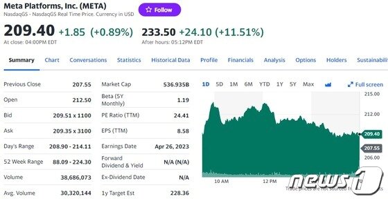 메타 실적 예상 상회, 시간외서 12%까지 폭등