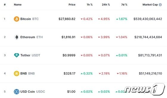 2일 오전 6시 현재 비트코인은 글로벌 코인시황 중계사이트인 코인마켓캡에서 24시간 전보다 4.95% 급락한 2만7860달러를 기록하고 있다. 비트코인 2만8000달러가 깨진 것은 지난 4월 27일 이후 처음이다.