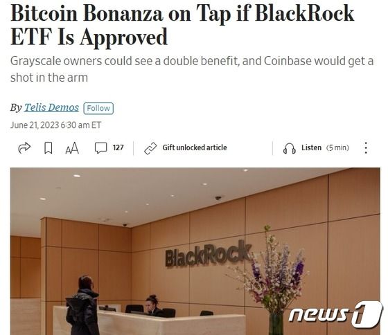 세계 최대 자산 운용사인 '블랙록'이 미국 증권 감독당국 증권거래위원회(SEC)에 현물 비트코인 ETF(상장지수펀드)를 신청한 가운데, SEC가 이를 승인할 가능성이 있으며, 만약 승인하면 암호화폐(가상화폐)에 대형호재라고 월스트리트저널(WSJ)이 21일(현지시간) 보도했다.