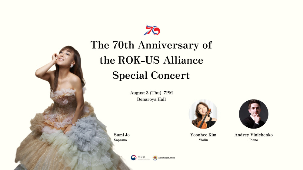 시애틀총영사관(총영사 서은지)은 한미동맹 70주년을 축하하기 위해 오는 8월 3일 오후 7시 시애틀 베나로야홀 테이퍼 오디토리움에서 세계적인 소프라노 조수미씨를 초청해 무료 콘서트를 개최한다. 무료 콘서트지만 시애틀 베나로야홀 예매 사이트를 통해 표를 예약한 뒤 무료로 구매해야 한다.