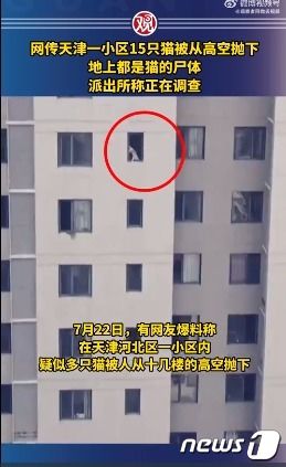 지난 22일 중국 동북부의 항구도시 톈진시 허베이구 한 아파트에서 한 남성이 아파트 10층 이상에서 아래로 고양이 여러 마리를 패대기쳤다.