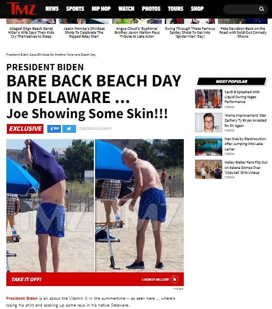 겔러 외에도 미국 연예매체 TMZ도 같은 시각 해변을 찾아 바이든 대통령의 사진을 찍어 "바이든 대통령 피부를 드러내다!(Joe Showing Some Skin!)"고 보도했다.