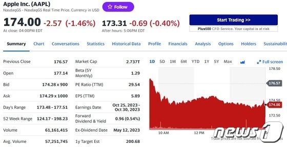 17일(현지시간) 뉴욕증시에서 애플은 전거래일보다 1.46% 하락한 174.00 달러를 기록했다. 이로써 시총이 2조7370억 달러로 집계됐다.