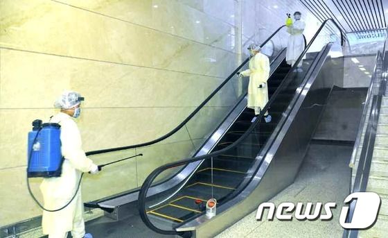 <북한 평양 공항에서 직원들이 신종 코로나바이러스 감염증 예방을 위해 소독약을 뿌리고 있다.>