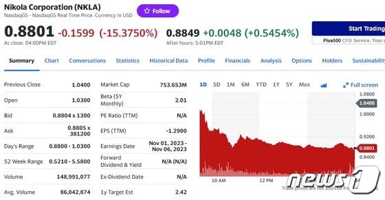 이로써 니콜라의 주가는 1달러 미만으로 다시 떨어졌다. 니콜라의 주가가 1 달러 미만으로 떨어진 것은 지난 7월 13일 이후 처음이다.