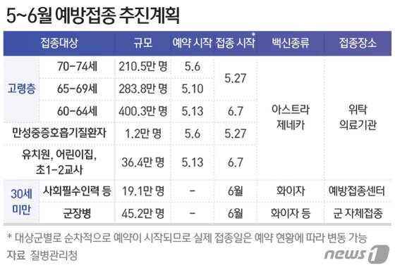 구체적인 예약 기간과 접종 기간은 65~69세(1952~1956년생)의 경우 예약이 5월 10일~6월 3일, 접종이 5월 27일~6월 19일까지다. 대상자는 283만8000명이다.
