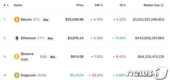 | 이 시각 현재 주요 암호화폐 시황 - 코인마켓캡 갈무리 |