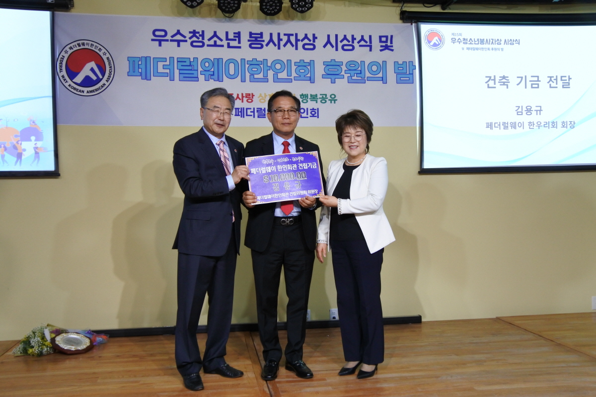 김 전 회장은 지난 11일 코앰TV에서 열린 페더럴웨이 한인회 우수청소년봉사상 시상식 및 후원의 밤에서 김영민 회장에게 올해도 1만 달러의 기금을 전달했다. 이에 따라 김 전 회장이 한인회관 건축기금으로 기부한 액수는 지난 5년 전부터 매년 1만 달러씩 모두 5만 달러로 늘어나게 됐다.