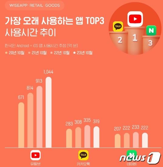 와즈앱 리테일 측은 "유튜브 사용시간이 빠르게 증가해 매년 유튜브와 카톡, 네이버 사이의 격차가 커지고 있다는 것이 이번 조사결과 나타났다"고 했다.