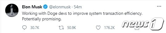 머스크 CEO는 이날 자신의 트위터에 “도지코인 개발자들과 함께 도지코인 거래 효율성 향상을 위해 공동 연구하고 있다”며 “상당히 유망하다”고 밝혔다.