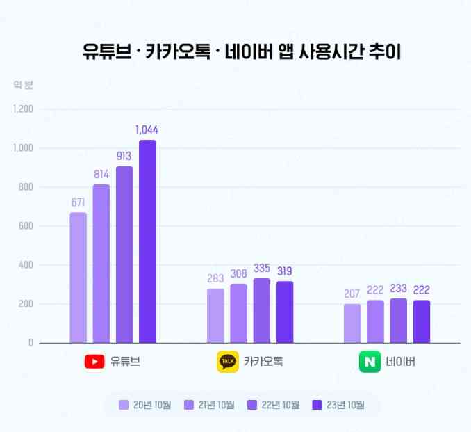 앱·리테일 분석 서비스 '와이즈앱·리테일·굿즈'(이하 와이즈앱)가 유튜브 앱의 사용 시간을 조사한 결과 2020년 10월 671억분이던 유튜브 앱 사용 시간은 올해 10월 1044억분으로 증가했다.