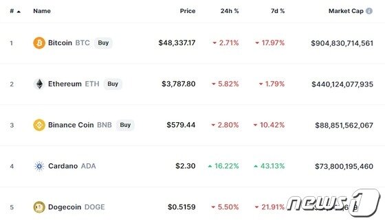 이 시각 현재 주요 암호화폐 시황 - 코인마켓캡 갈무리 |