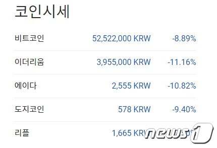 같은 시각 비트코인은 한국의 업비트에서 24시간 전보다 8.89% 급락한 5252만2000원에 거래되고 있다. 이더리움도 11.16% 폭락한 395만5000원을 기록하고 있다.