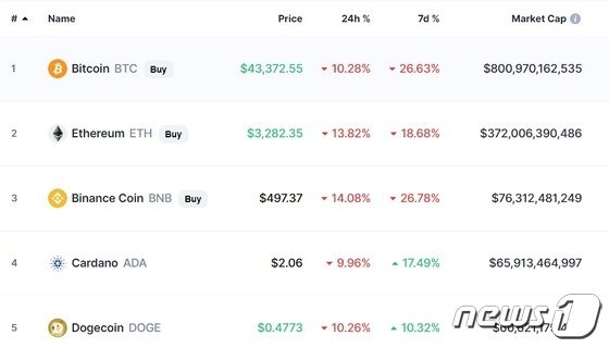 17일 오후 1시30분 현재(한국시간 기준) 비트코인은 글로벌 암호화폐 시황 중계 사이트인 코인마켓캡에서 24시간 전보다 10.28% 폭락한 4만3372달러를 기록하고 있다.