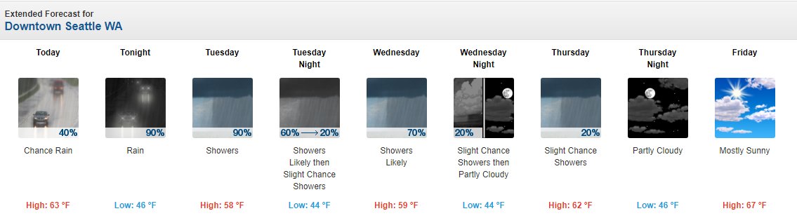 기상청은 첫 주일이 시작되는 17일 시애틀지역에는 간간히 비가 내리면서 다운타운을 기준으로 낮 최고기온이 63도에 그친 뒤 17일 밤부터 빗발이 굵어지겠으며 18일에는 비가 계속되면서 낮 최고 기온이 58도에 머물겠다고 밝혔다.