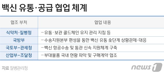 정부는 국내에서 신속하고 안전한 백신 유통을 위해 오는 2월 첫째주 중 질병청, 국방부, 관세청, 식약처가 협력한 모의 유통 훈련을 실시한다. 수송 단계별 콜드체인 유지 여부와 위기 대응 등 체계를 점검한다.