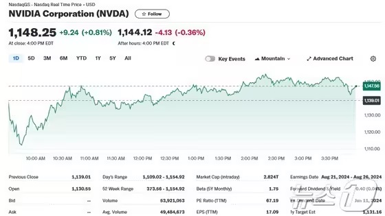 29일(현지시간) 뉴욕증시에서 엔비디아는 전거래일보다 0.81% 상승한 1148.25달러로 장을 마감했다.
