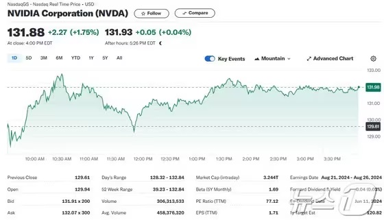14일(현지시간) 뉴욕증시에서 엔비디아는 전거래일보다 1.75% 상승한 131.88달러를 기록했다. 이는 사상 최고치다.