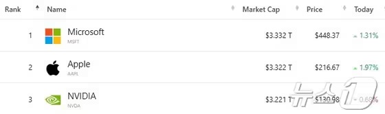 17일(현지시간) 현재 시총 순위는 MS가 3조3320억달러로 1위, 애플이 3조3220억달러로 2위, 엔비디아가 3조2210억달러로 3위다.
