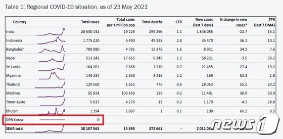 북한 당국이 지난달 23일 현재 코로나19 누적 확진자 수가 '0명'이라고 세계보건기구(WHO)에 보고했다. (WHO 남·동아시아 사무소 '코로나19 주간 상황 보고서' 캡처) © 뉴스1 |