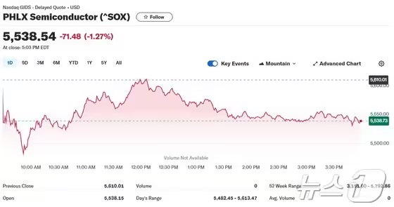 21일(현지시간) 뉴욕증시에서 반도체지수는 전거래일보다 1.27% 하락한 5538.54포인트를 기록했다.