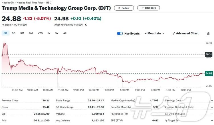 12일(현지시간) 뉴욕증시에서 트럼프 미디어의 주가는 전거래일보다 5.07% 급락한 24.88달러를 기록했다.