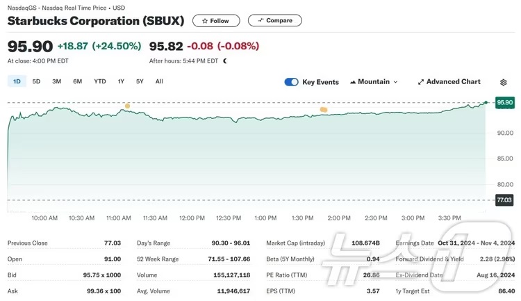 13일(현지시간) 뉴욕증시에서 스타벅스는 전거래일보다 24.50% 폭등한 95.90달러를 기록했다.