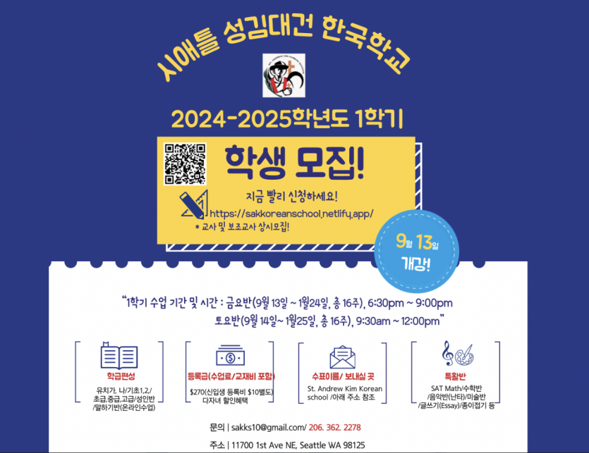 일명 '시애틀 한인성당 한국학교'인 34년 전통의 성 김대건 한국학교(교장 박윤기 하비에르 신부, 교감 신정희)가 다음달 개강하는 2024~2025학년도 1학기 학생 등록을 받고 있다.
