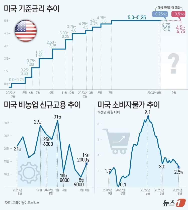 현재 연준 금리는 5.25~5.5%로 23년 만에 최고 수준이 1년 넘게 유지됐다. 40년 넘게 만에 최고로 올랐던 인플레이션은 목표 2%에 최근접한 2.5% 수준으로 내려왔고 펄펄 끓었던 고용 시장은 냉각되기 시작했다는 것이 이코노미스트들의 견해다. 이에 따라 FOMC는 연준의 이중책무 물가안정과 완전고용 중에서 고용에 중점을 두며 금리 인하에 나선다는 것이 기정사실화했다.