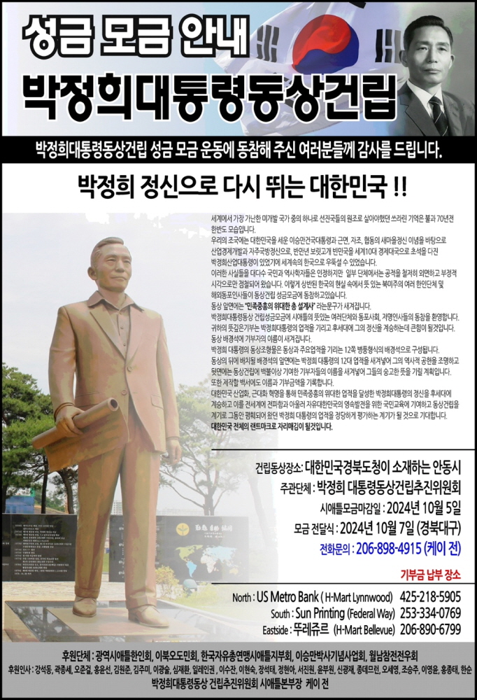 박정희대통령동상건립위원회 시애틀본부(본부장 케이 전)는 현재 한국에서 추진중인 박정희대통령 동상 건립기금에 보태기 위한 모금 운동을 펼치고 있다며 기부를 당부하고 있다.