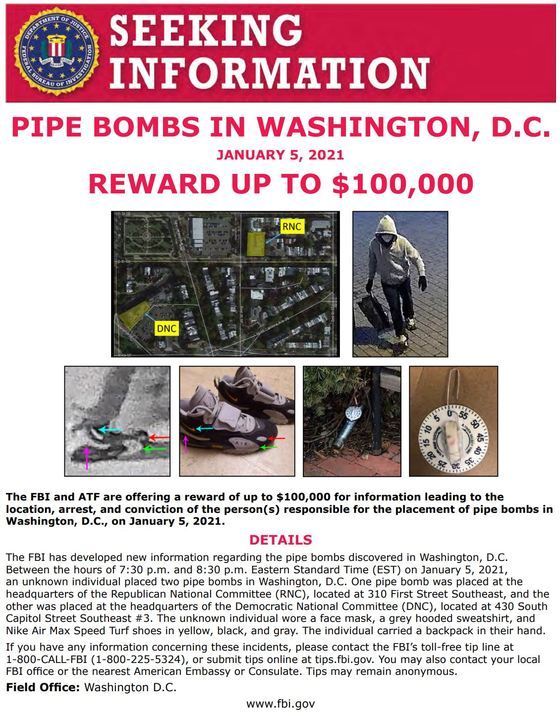 미 연방수사국(FBI)이 의사당 난입 사태 전날 밤 민주당 및 공화당 전국위원회 본부에 사제 폭탄을 설치한 용의자에 현상금 최대 10만달러(약 1억1000만원)를 걸고 수배에 나섰다.