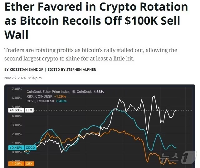 랠리하던 비트코인이 급락하는 대신 시총 2위 이더리움이 상승하는 등 암호화폐(가상화폐) 시장에서 순환매가 발생, 비트코인이 연말까지 횡보할 가능성이 커지고 있다고 암호화폐 전문매체 코인데스크가 25일(현지시간) 보도했다.