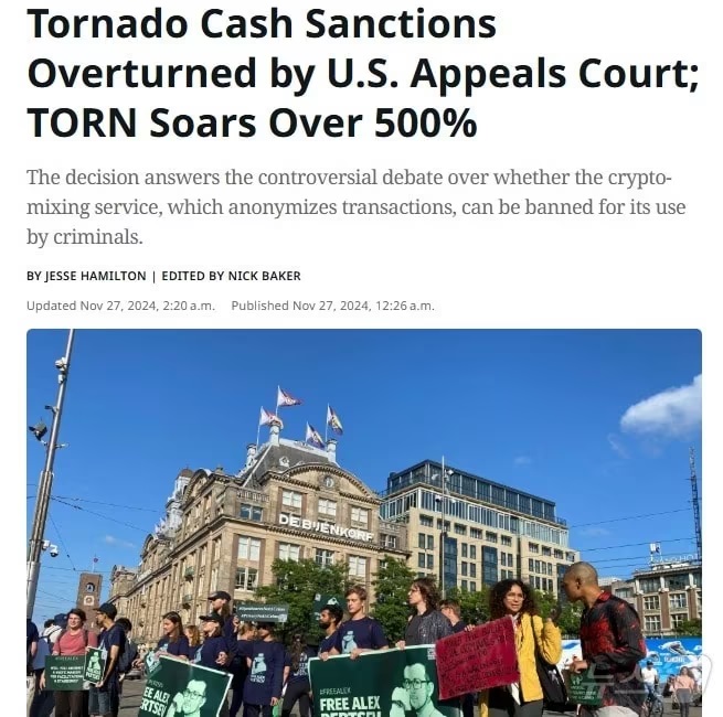 이는 이날 미국 루이지애나주 뉴올리언스 제5 연방 항소법원이 토네이도 캐시에 유리한 판결을 내렸기 때문이라고 암호화폐(가상화폐) 전문매체 코인데스크가 보도했다.