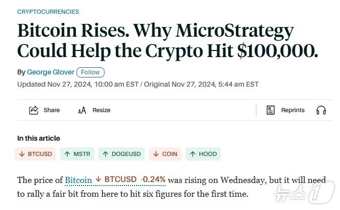 이에 따라 비트코인 10만달러 돌파 여부는 마이클 세일러에게 달려 있다고 배런스는 평가했다.