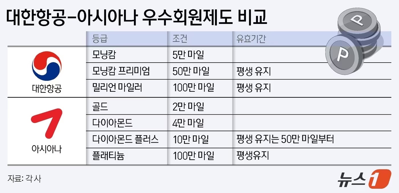 마일리지와 연계된 양사의 우수회원 제도도 민감하다. 대한항공 모닝캄과 비교해 아시아나클럽은 우수회원 가입 및 유지 조건이 세분돼 있다. 우수회원 제도 중 가장 낮은 등급인 모닝캄이 5만 마일인데, 같은 단계인 아시아나클럽 골드는 2만 마일이다. 향후 대한항공과 마일리지를 합산해도 모닝캄 기준을 넘지 못하면 라운지 이용 등 혜택을 못 볼 수 있는 셈이다.