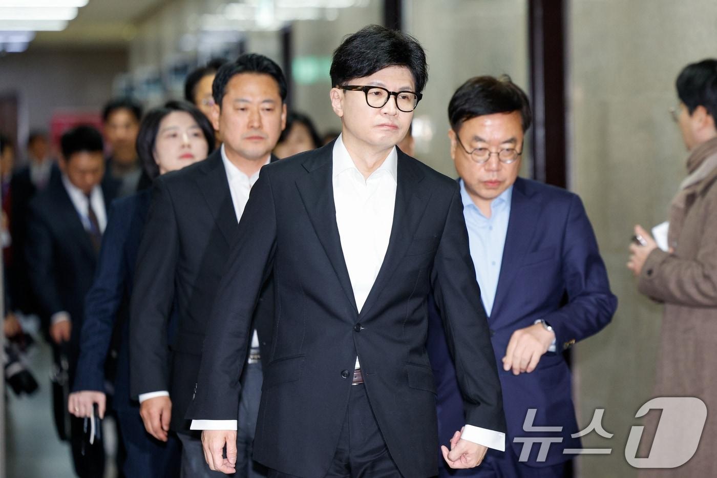 한 대표는 이날 의총에 앞서 긴급최고위원회를 주재하며 △내각 총사퇴 △김용현 국방부 장관 등 책임자 처벌 △윤석열 대통령 탈당 등 세 가지 제안을 했다. 한 대표는 "의원총회에서 굉장히 많은 의원들의 난상 토론이 있었다"며 "윤 대통령의 탈당에 대해선 여러 의견이 있어서 계속 의견을 듣기로 잠정 결론을 낸 상태"라고 했다.