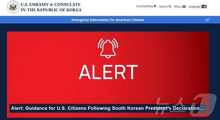 주한 미 대사관은 이날 영문 웹사이트 홈페이지에 적색 경보를 발령하고 '경보: 한국 대통령의 계엄령 선포에 따른 미국 국민을 위한 지침' 안내문을 게재했다.