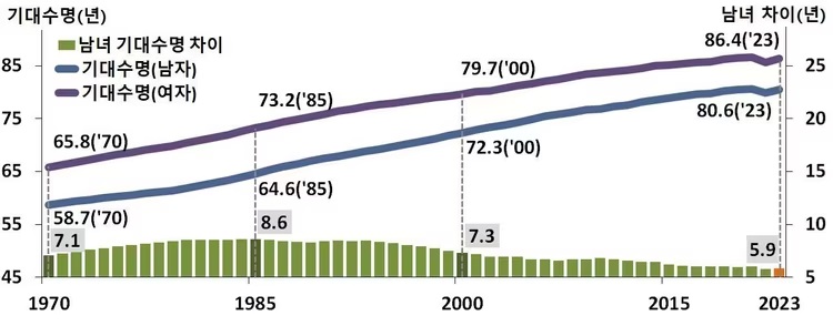 지난해 남자의 기대수명은 80.6년, 여자는 86.4년으로 전년 대비 남자는 0.7년, 여자는 0.8년 증가했다. 남녀 격차는 5.9년으로 1985년(8.6년)을 정점으로 감소하는 추세다.