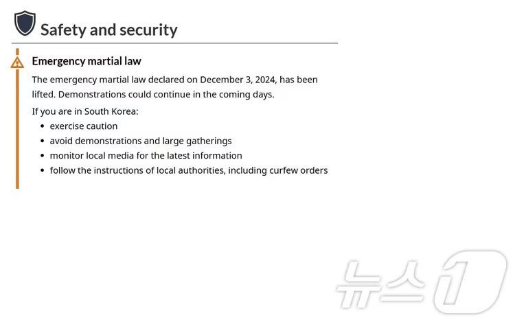 캐나다 정부는 "12월 3일 선포된 비상계엄이 해제됐지만 앞으로도 시위는 계속될 수 있다"며 "한국에 있을 경우 △주의를 기울이고 △시위 및 대규모 집회를 피하고 △현지 미디어를 통해 최신 정보를 확인하며 △통행금지 명령 등 현지 당국의 지시를 따르라"고 설명했다.