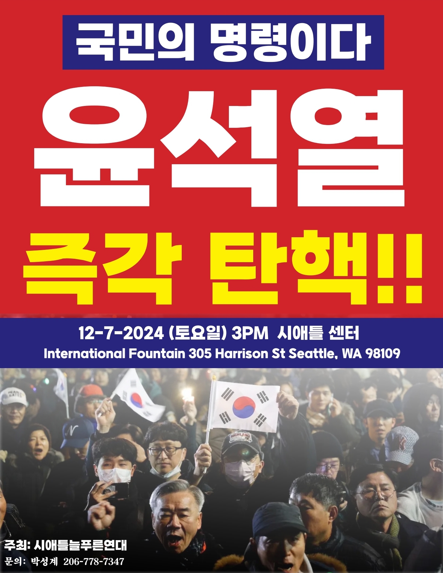 한국시간으로 지난 3일 밤 비상계엄을 선포한 윤석열 대통령의 탄핵이 추진되고 있는 가운데 시애틀에서도 윤 대통령의 탄핵을 촉구하는 시위가 벌어진다.