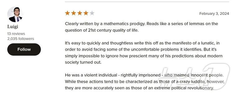 미국 CNN 방송 등 외신에 따르면, 9일(현지시간) 펜실베이니아주 앨투나에서 체포된 만조니는 독서 리뷰 사이트인 굿리즈(Goodreads)에서 연쇄테러범 시어도어 카진스키가 쓴 '산업사회와 그 미래'라는 책에 별 5개 만점에 4개를 주고 리뷰글을 남긴 것으로 확인됐다.