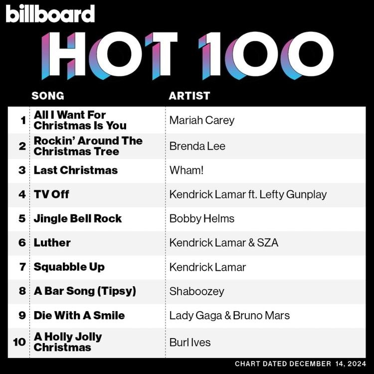 빌보드가 9일(현지시간) 발표한 탑100 차트에 따르면 캐리의 크리스마스 캐럴 '올 아이 원트 포 크리스마스 이즈 유'(All I Want for Christmas Is You)는 지난주보다 9계단 올라 1위를 차지했다.