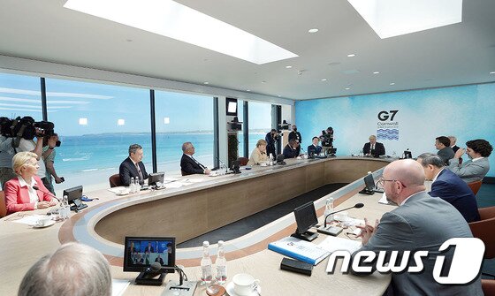 G7 정상회의 참석차 영국을 방문 중인 문재인 대통령이 13일(현지시간) 영국 콘월 카비스베이에서 열린 기후변화 및 환경' 방안을 다룰 확대회의 3세션에 참석하고 있다. (청와대) 2021.6.14/뉴스1 |