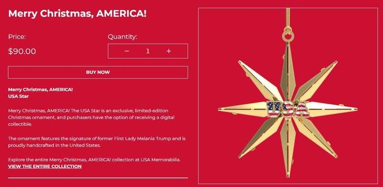 각 장식품에는 멜라니아의 서명이 새겨져 있으며, 중앙에 성조기 무늬로 'USA'가 적힌 황금색 별 모양부터 자유의 여신의 모습이 그려진 장식품 등이 판매되고 있다.