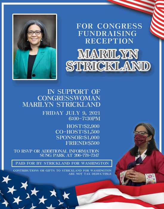 워싱턴주 타코마 출신인 한인 미 연방 하원의원인 매릴린 스트릭랜드 의원을 위한 한인사회 후원회 및 간담회가 오는 7월9일 오후 6시 열린다. 후원회 장소는 예약자에 한해 개별적으로 통보해줄 방침이다.