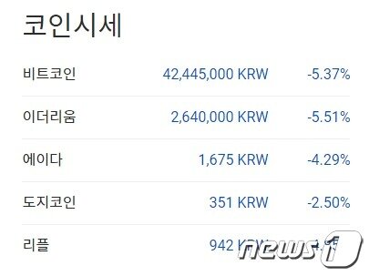 같은 시각 한국의 거래사이트인 업비트에서도 비트코인은 24시간 전보다 5.37% 급락한 4244만5000원에 거래되고 있다.