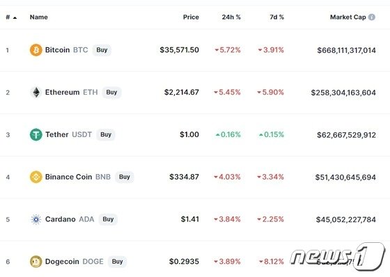 비트코인은 19일 오전 7시 현재(한국시간 기준) 글로벌 시황 중계 사이트인 코인마켓캡에서 24시간 전보다 5.72% 급락한 3만5571달러를 기록하고 있다.